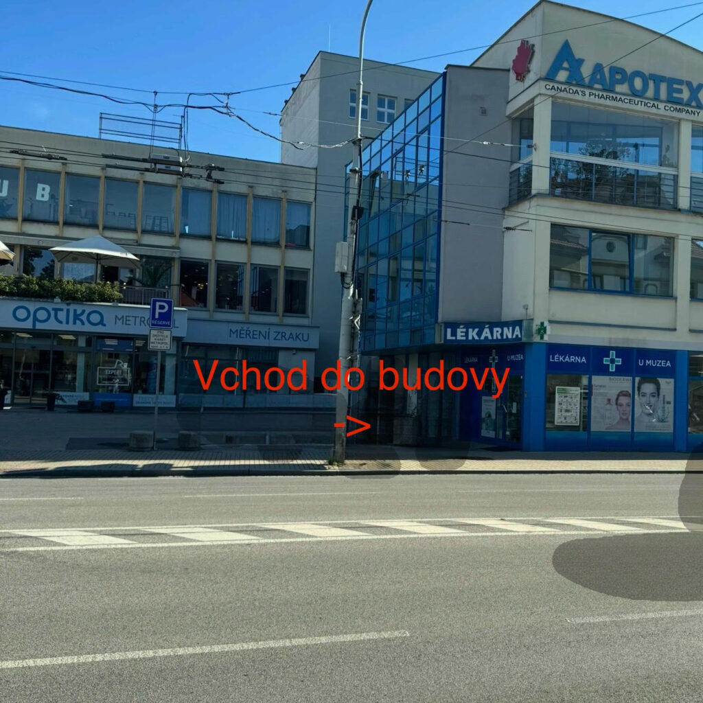 Stačí přejít přes cestu, dveře se nacházejí hned za vchodem do lékárny.